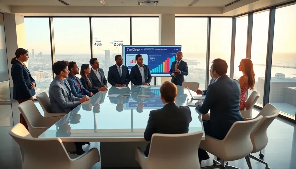 real estate team discussing market trends in a San Diego office.